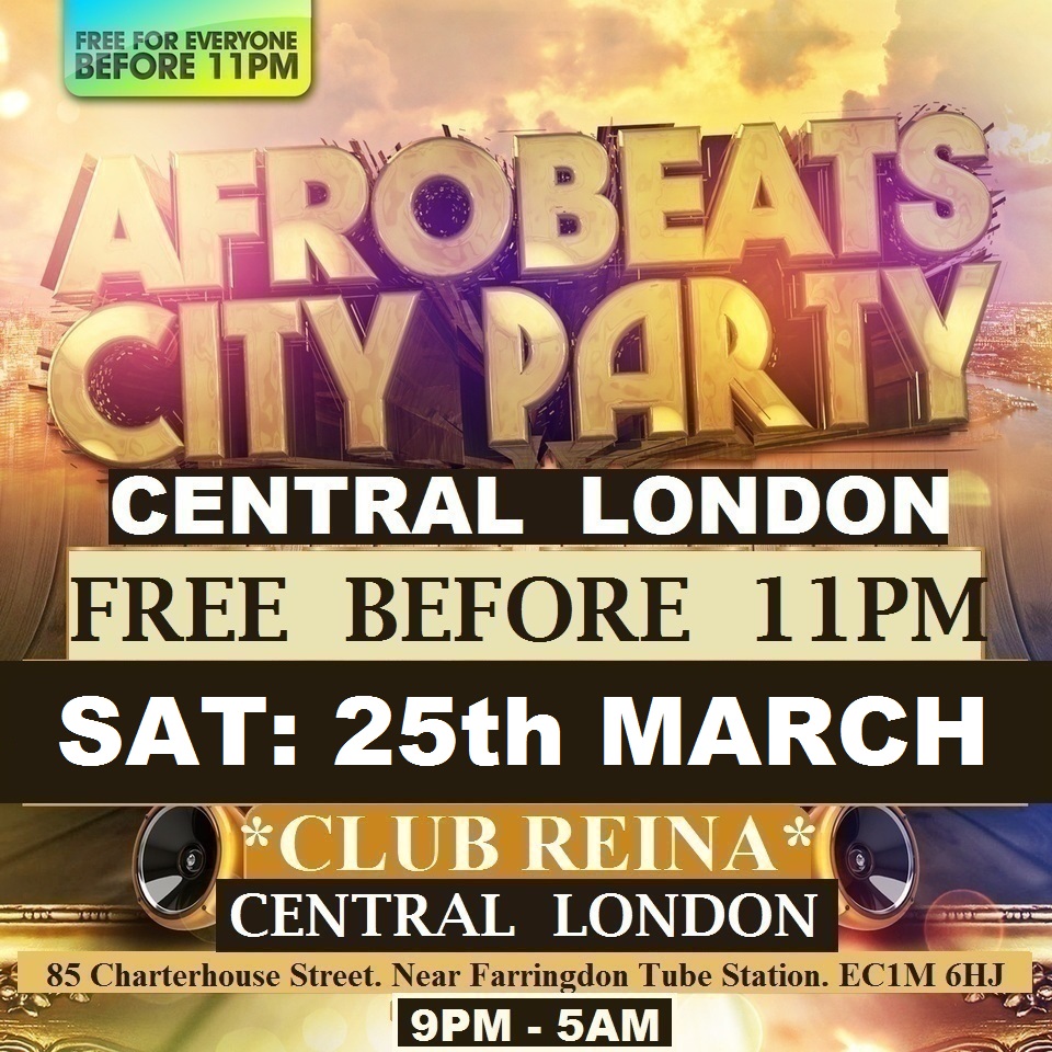 ★AFROBEATS CITY PARTY★ --(CENTRAL LONDON)-- *SATURDAY: 25th March, 2017* @ CLUB REINA (CENTRAL LONDON - NEAR FARRINGDON STATION) ---------------------------- 2 ROOMS OF MUSIC: -----------...
