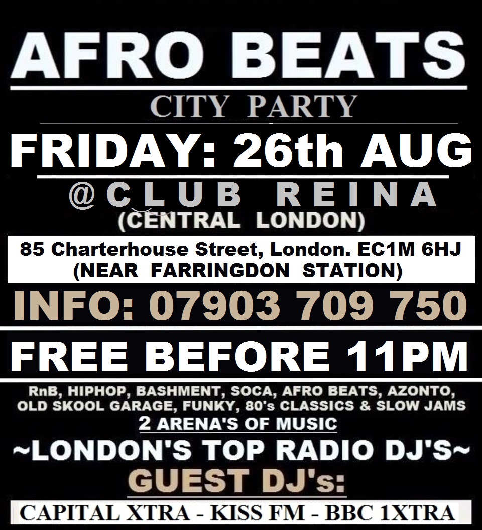 ★AFROBEATS CITY PARTY★ ---(CENTRAL LONDON)--- ------------------------------- ★FREE BEFORE 11PM★ ------------------------------- **SAT: 27th AUGUST, 2016* @ CLUB REINA (CENTRAL LONDON - ...