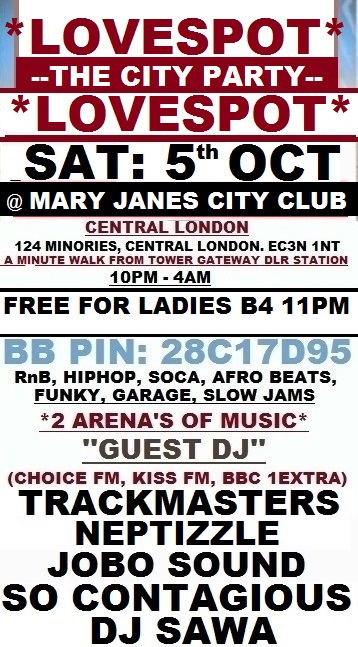 **LOVESPOT -->** --(City Party)-- **LOVESPOT -->** --(City Party)-- **FREE FOR LADIES (BOOK FREE TICKETS)** SAT: 12th OCTOBER @ MARY JANES CITY CLUB (CENTRAL LONDON) **FREE BEFORE 1...